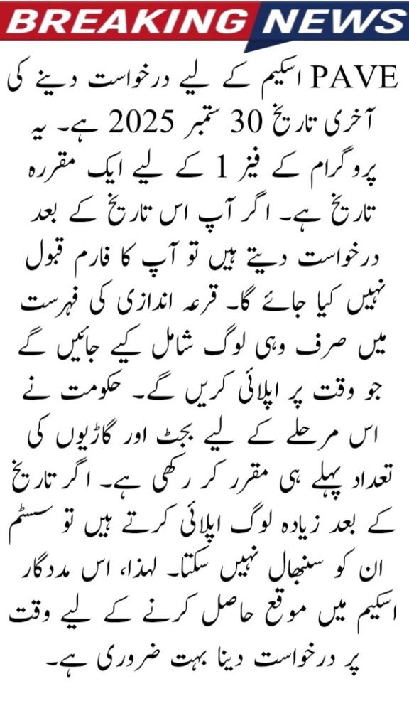 The government of Pakistan has launched the PAVE Vehicle Scheme 2025 to provide electric bikes and rickshaws to the people through a subsidy program. Many students, workers, and low-income citizens are applying for this opportunity. But it is important to know the last date to apply for this scheme. If you miss the deadline, your application will not be accepted in Phase-1. In this article, we will explain the final date, what happens after that, and what steps you should follow before applying. Everything is written in simple words so that matric students can understand easily.