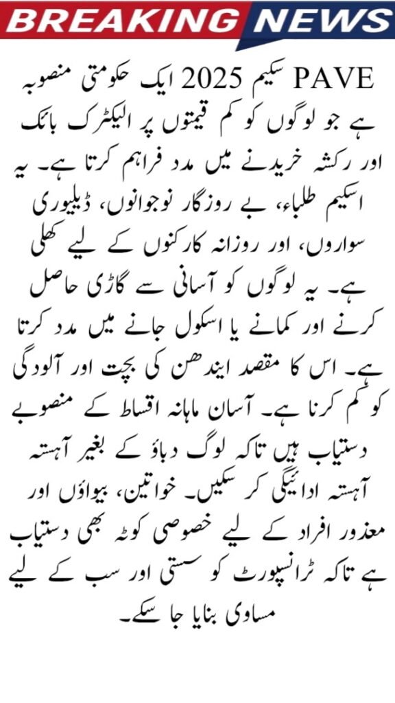 The government of Pakistan has started a new program called the PAVE Scheme 2025. This is also known as the PM Electric Bike and Rickshaw Scheme. The main goal of this scheme is to help students, women, and low-income people by giving them electric bikes, rickshaws, and three-wheelers at lower prices. The government wants to reduce fuel costs and pollution. This program is part of the New Energy Vehicle Policy 2025–30. People can apply online through a special website. In this article, we will explain the important details about the scheme, including how to apply, what documents are needed, and the last date to apply.