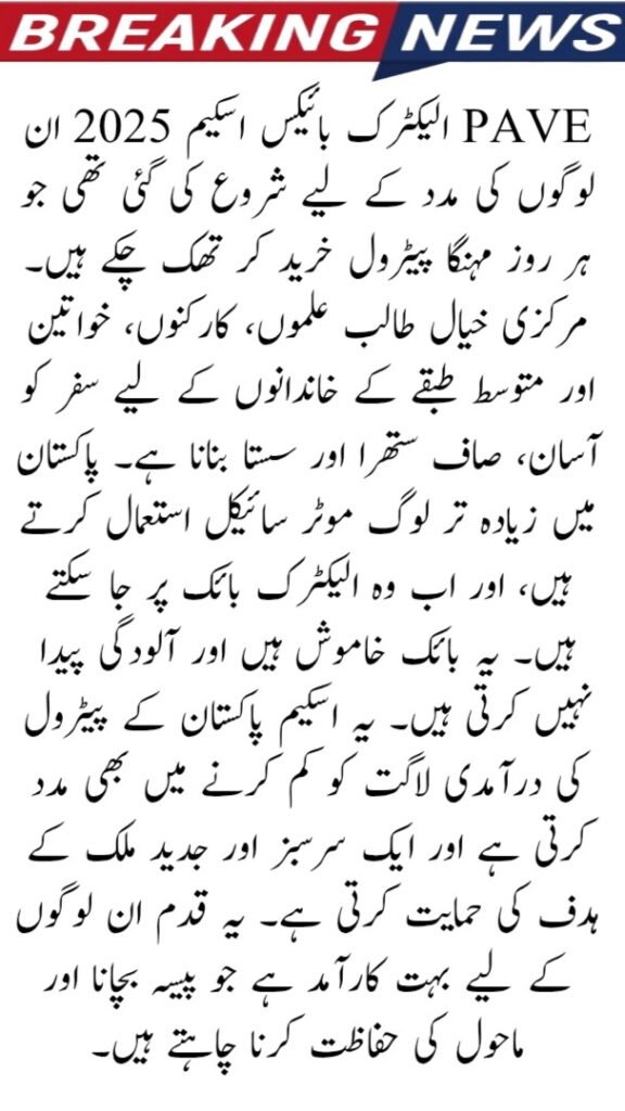 The PAVE Electric Bikes Scheme 2025 was launched to help people who are tired of buying expensive petrol every day. The main idea is to make travel easy, clean, and cheaper for students, workers, women, and middle-class families. Most people in Pakistan use motorcycles, and now they can switch to electric bikes. These bikes are quiet and don’t create pollution. The scheme also helps to reduce Pakistan’s petrol import costs and supports the goal of a green and modern country. This step is very useful for people who want to save money and protect the environment.